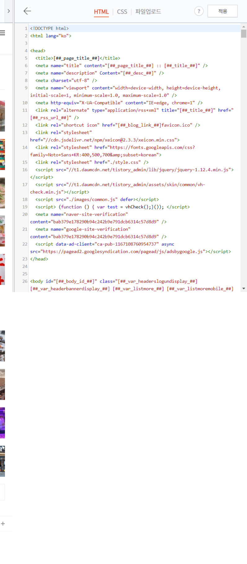 4. 내 티스토리 설정 - 왼쪽 사이드 메뉴 - 꾸미기 - 스킨편집 - HTML 편집 - <head>와 </head> 사이에 복사한 코드 붙여넣기 - 적용