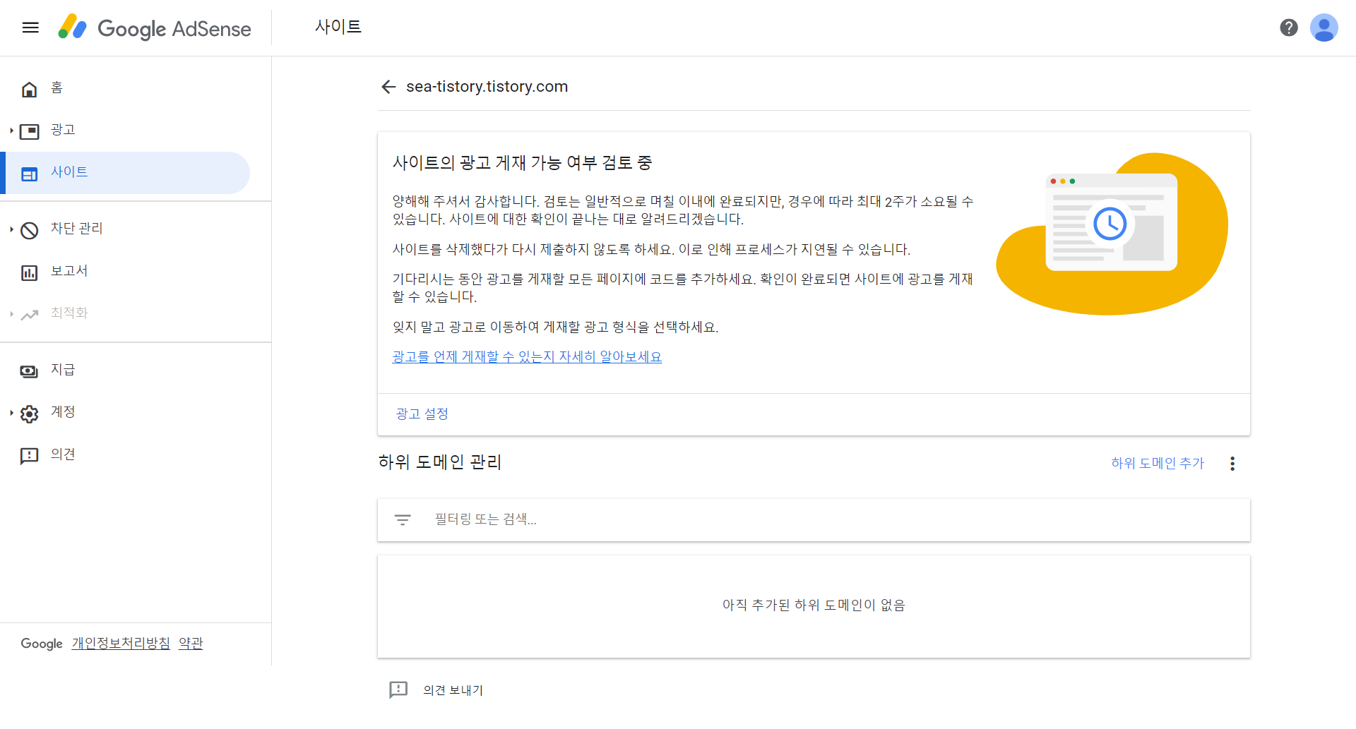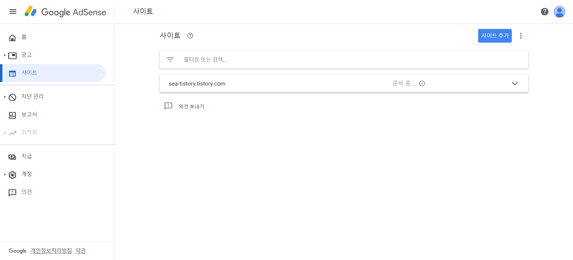 5. 다시 구글 애드센스로 와서 사이트 - 사이트 추가 - 내 티스토리 주소 넣고 등록 !