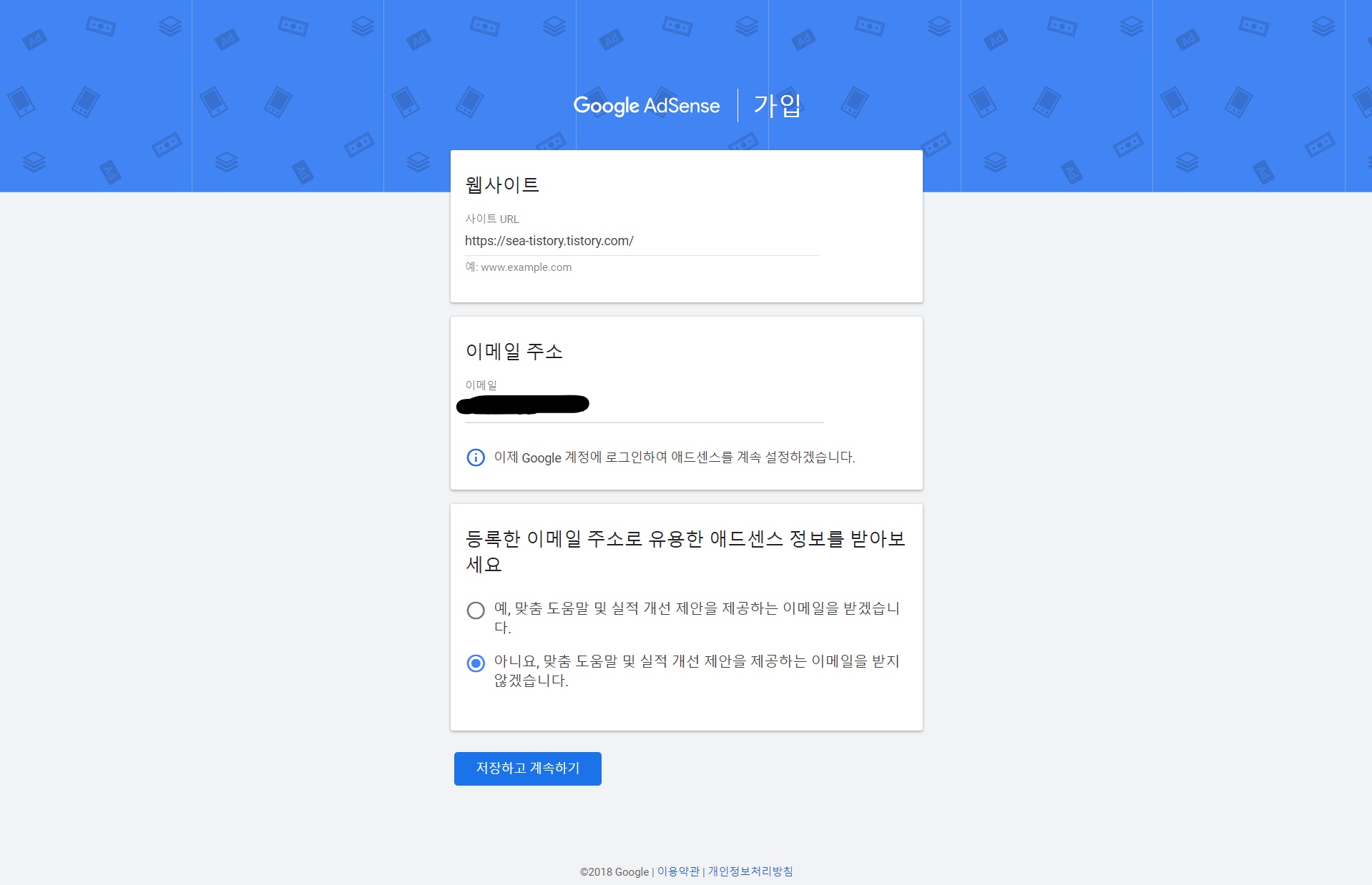 2. 웹사이트에 티스토리 주소 입력, 이메일 주소에는 내 구글계정 입력