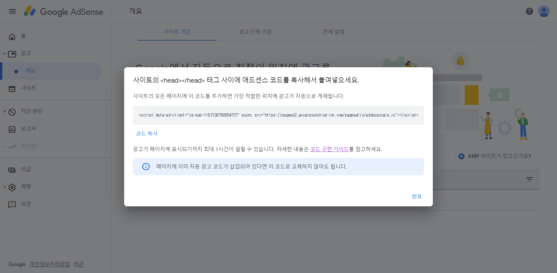 3. 다른 사람들은 바로 애드센스 코드 안내문 나오던데 나는 애드센스 메인 페이지가 나왔다ㅠ 왼쪽 사이드바 메뉴에서 개요 들어가면 애드센스 코드가 나오는데 복사