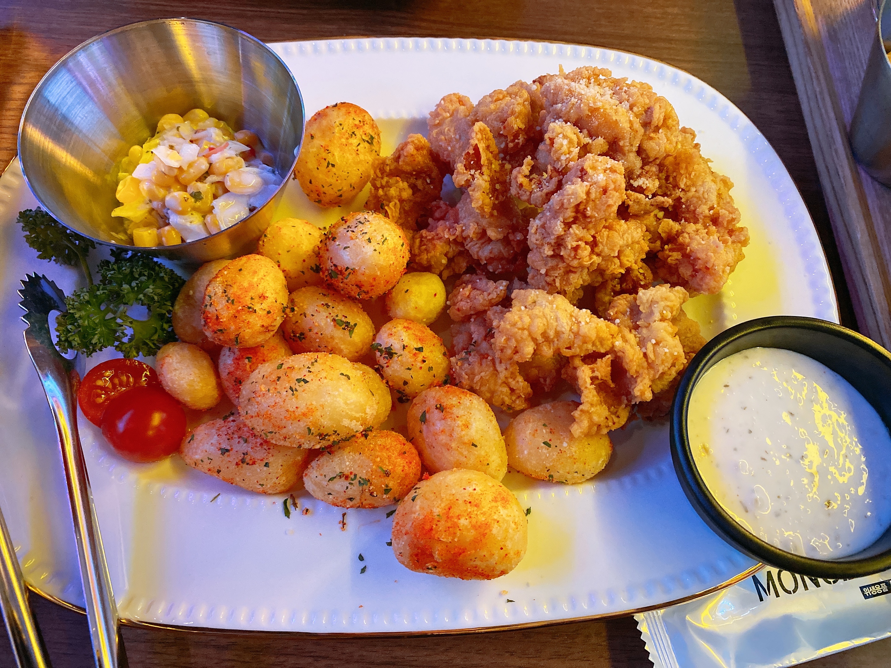 몽담 순살치킨이에요~ 이게 7900원 실화?! 가성비 짱..! 맛은 딱 보여지는 맛!보다 조금 더 맛있었어요ㅎㅎ 치킨도 짭잘하니 진짜 맛있었고 감자는 휴게소 알감자맛이랑 비슷했어요 ㅋㅋㅋ소스는 타르타르소스 같았어용
